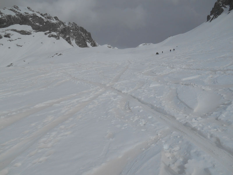 Nous parvenons devant des pentes raides. Comme la neige est cartonnée avec des plaques gelées nous mettons les couteaux sous les skis. Deux skieurs, plus loin, nous précèdent. Nous effectuons le même trajet. Malgré tout j'effectue la trace. Nous approchons d'une goulotte. Une plaque à vent s'est détachée, au passage des skieurs. Nous hésitons, puis montons dans la goulotte, où une corniche s'est effondrée. L'endroit n'est pas rassurant !