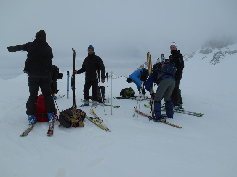 Un vent glacial nous frictionne. Le brouillard est retombé. Nous plongeons dans l'inconnu. La visibilité n'est que de quelques mètres. La descente s'avère périlleuse. Olivier part en éclaireur. Nous suivons nos traces de montée. Peu à peu le contact avec cette neige particulière fini par nous familiariser. Des larges traces facilitent une bonne glisse.