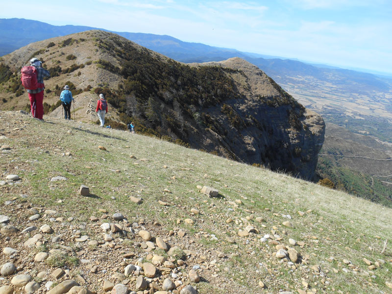 Nous redescendons du sommet. Les falaises de La Cantera sont impressionnantes, plongeant dans l'abîme. Au sud des Mallos surgissent des barrancos de La Carboneras. Jaca et des villages occupent la plaine. Des vautours tournoient au-dessus de nos têtes et s'éloignent vers l'horizon. Suivant la crête, nous revenons au pic de San Salvador (1547 m.) et l'ermitage San Salvador. Les deux groupes s'installent pour déjeuner au soleil avec un vent léger.