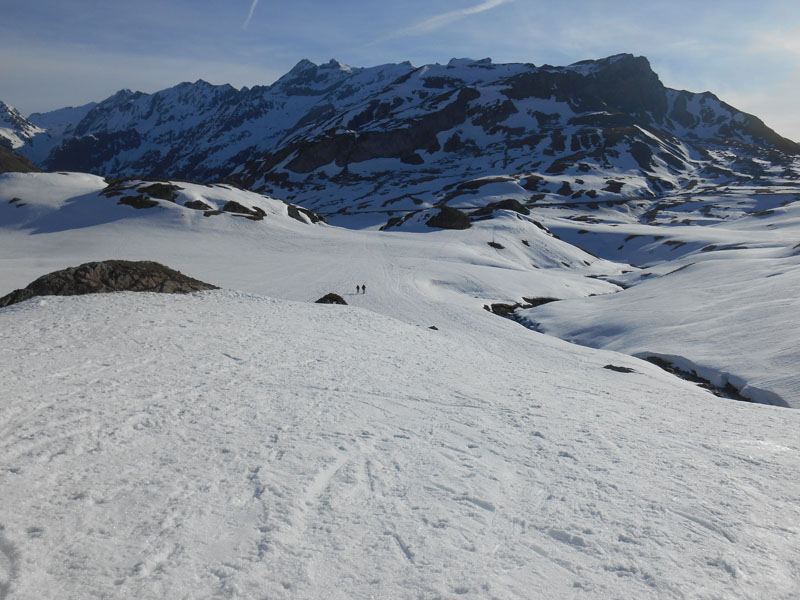 La fraîcheur se fait sentir. Il est temps de repartir. Raquettes aux pieds Andrée et Pierrot entament la descente du col. Je file sur mes skis, tandis qu'ils s'éloignent de mon champ de vision. Je cherche les meilleurs endroits de glisse, mais la neige n'est pas bien agréable, même si elle a un peu fondu en surface.