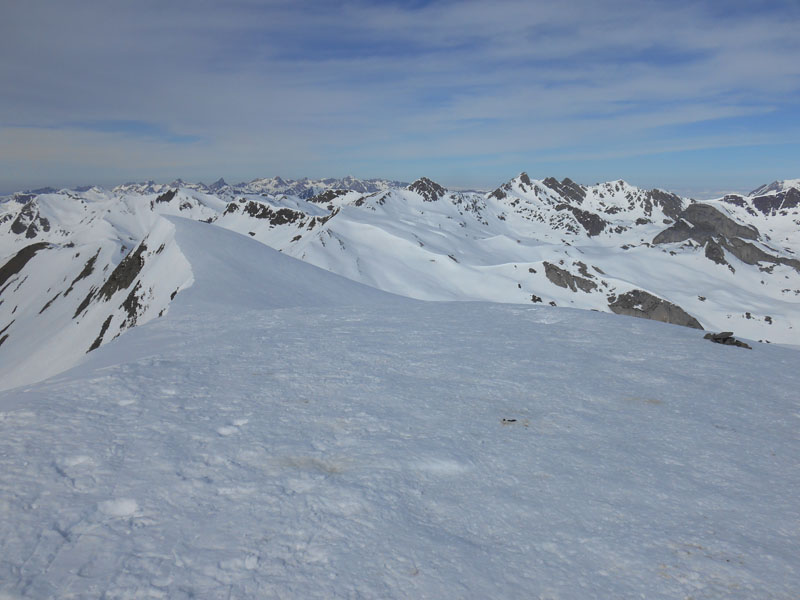 Je pose les couteaux sous les skis pour la montée au col de Houer. Un randonneur espagnol laisse ses skis au col et monte en crampons au sommet. En effet, parvenu au col lorsque je poursuis vers le sommet la neige est encore plus gelée et les couteaux griffent à peine le sol blanc brillant.