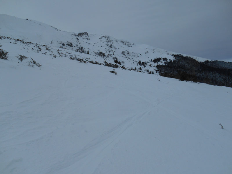 Marie, Sylvie,Philippe et moi-même suivons par erreur des skieurs qui ne vont pas au même endroit. A travers une végétation rase, nous slalomons. Quelques endroits sont en neige poudreuse et agrémentent la glisse.