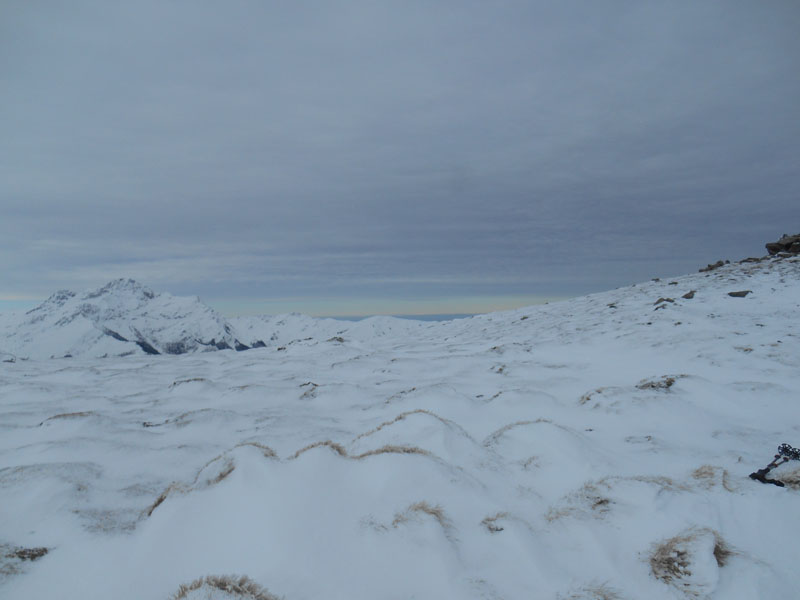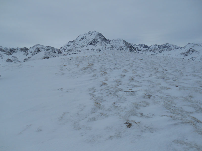 L'observation attentive du relief amène Béatrice à éviter les fortes pentes et les passages sous corniches, car le risque d'avalanche est de niveau 3. Le ciel se couvre subitement de nuages. Le trajet frôle le Soum de Castet (1591 m.), que nous laissons à notre gauche.