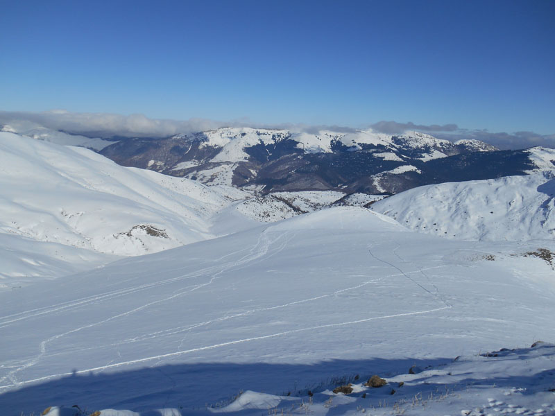 Chaussant les skis hors des rochers, car le manque de neige concerne les sommets balayés par les vents, nous nous lançons dans les pentes en neige cartonnée. En recherche de neige skiable, nous évoluons sur des larges pentes. Le mélange est surprenant. Entre neige poudreuse et neige tumultueuse, le ski devient un exercice d'équilibriste. Philippe en fait les frais (et oui la neige est fraîche.) en la goûtant de près.
