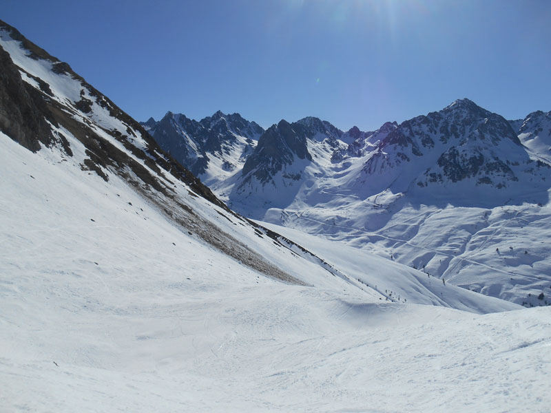 La descente vers la gorge est en neige cartonnée, commençant même à geler. Après avoir repéré le pont de neige, nous remontons la moraine. Ensuite c'est la descente sur la piste du Tourmalet et les excès de vitesse, tant le ski est facile sur une piste damée.
