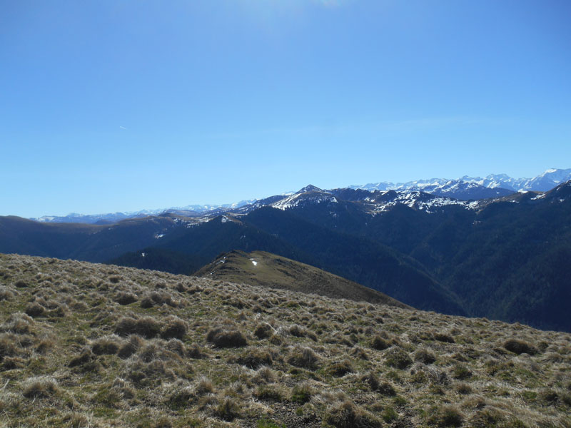 Des cimes nouvelles se révèlent : Mont Aspet, Montagne d'Areng, Mont Né, pic Portarras, pic d'Aret, pic Long et bien d'autres. A la recherche d'un endroit protégé du vent, c'est légèrement en contrebas du sommet que nous déjeunons, au spectacle des montagnes, arrosés des rayons du soleil.