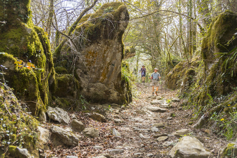 8 h 30, avec Andrée et Ludovic, nous prenons la direction de la vallée d'Ossau. Après Louvie Juzon, nous nous garons près d'un bois. Le chemin grimpe au milieu des arbres essentiellement des hêtres qui s'habillent de jeunes pousses. Une petite fontaine creusée dans un rocher laisse couler un filet d'eau.