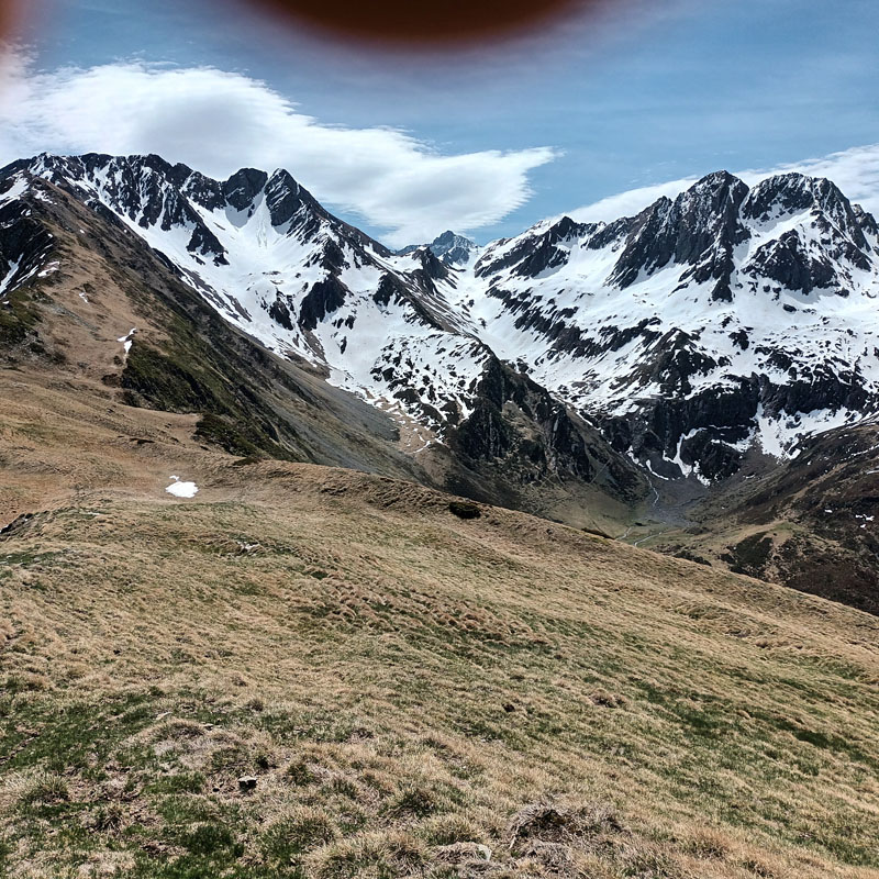 Différents sentiers mènent à la Hourquette de Mount Agut (1977 m.). Olivier parfait connaisseur des lieux souvent empruntés en ski de randonnée, donne la direction, tout en citant les sommets s'élevant face à nous.