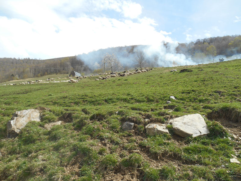 Un écobuage (ou pollubuage) semble poursuivre un troupeau de moutons. Le risque est de provoquer un énorme méchoui. Entre le sol et ses superbes fleurs, les petits villages accrochés aux flancs des massifs, l'horizon et ses cimes blanches dentelées, ce monde montagnard est un oasis chimérique dans un univers de tourments. Nous revenons au village de Betpouey à 16 h.