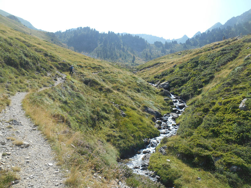 Puis le sentier grimpe à découvert dans une vallée verdoyante et fleurie, avec une magnifique vue sur les cimes : Soum de la Hourquette de Larry, crête du pic de Larry, de Las Très Pundettes de Larry, etc. Ludovic file devant et prend souvent des photos.