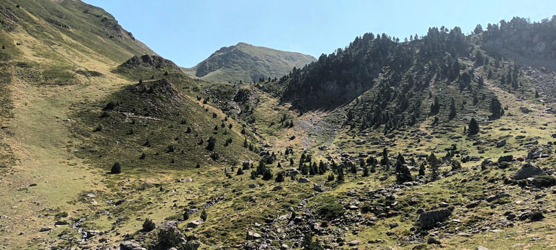 Hors sentier nous grimpons par des pentes raides, couvertes d'herbes hautes, de cailloux, de rhododendrons. Nous atteignons des falaises. Nous nous installons mi-ombre, mi-soleil pour déjeuner, rafraîchis par des rafales de vent. À l'ouest défilent les cimes de Souperet, du pic de Baralet, de la Montagne de Couecq, de Labigouer, mais tout se confond avec d'autres antécimes.