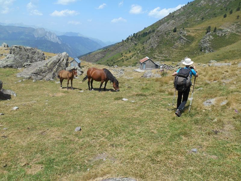 La descente est lente. La prudence est recommandée dans ce terrain irrégulier et instable. Le petit refuge de Larry est bien aménagé ; tables, bancs, matelas, poêle, réchaud, etc. . Les occupants sont partis. Chevaux et poulains se déplacent à notre rencontre. Peut-être pour la photo ?