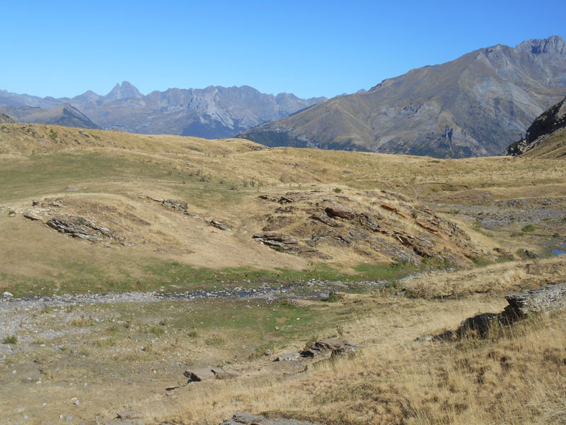 8 h 30, le chemin traverse le pont sur le rio Bolàtica. La fraîcheur surprend , mais l'astre solaire baigne dans un beau ciel bleu. Le sentier monte dans un bois au sud. Lorsque nous en sortons un vaste vallon herbeux s'ouvre, m'étant en évidence les cimes et massifs des alentours, la Tendenera et à l'ouest la Tenera.