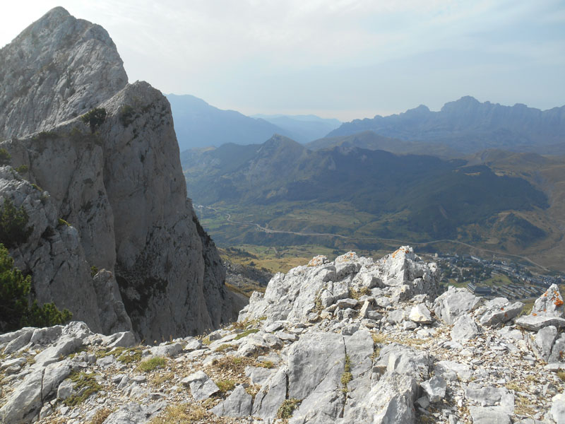 Puis ce sont les pics d'Enfer qui se détachent avec leurs dalles calcaires imitant les glaciers. Le Garmo Negro, le Musales se signalent également. La boucle continue à contourner la Foratata parmi les pins. Puis une longue montée sans ombre, nous mène au col Baladrias (1764 m.), avec vue sur Formigal, le lac de La Sarra.