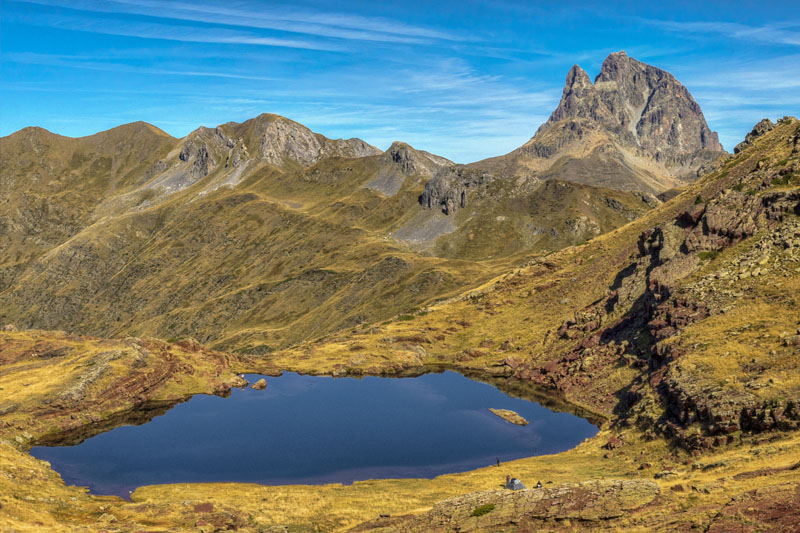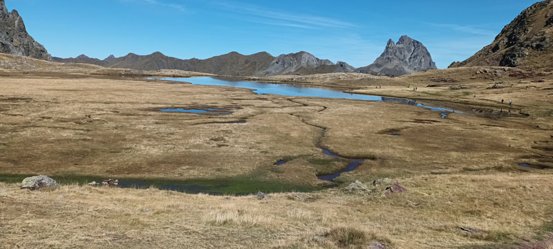 Nous parvenons sur le vaste plateau d'Anayet. Le lac d'Anayet s'étale dans la prairie aux reflets verts, avec un niveau d'eau exceptionnellement bas. Un autre lac bleu, en contrebas, scintille au soleil. Le pic du Midi d'Ossau surgit au nord. Le pic d'Anayet et le vertice d'Anayet, s'imposent face au lac. La Punta dera Arroyetas et sa crête barre l'horizon au sud.