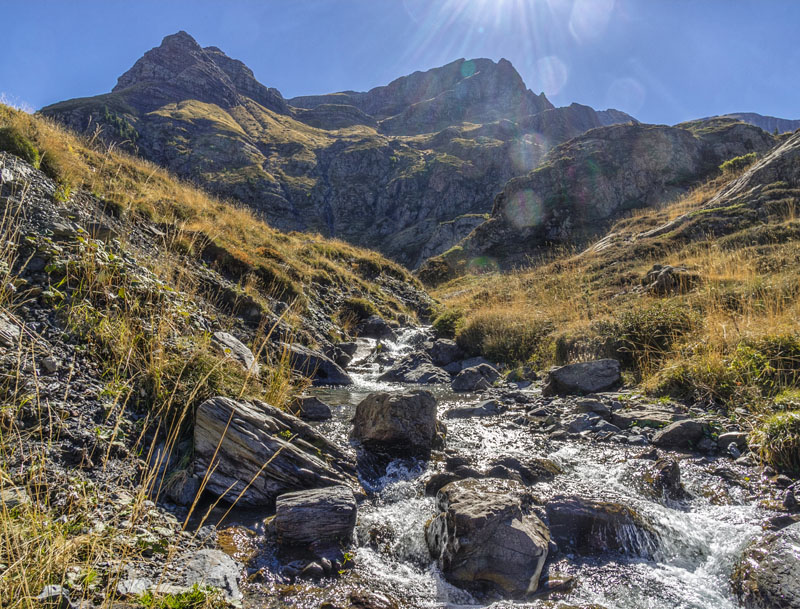 La descente dans les passages raides de la roche, ruisselante par endroit, ralentie la progression. Cependant le vallon parcouru par les ruisseaux agrémente la traversée, rendant paisible le retour. Ludovic en profite pour patauger dans de petites vasques dans une eau très fraîche.