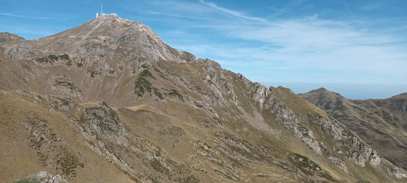 Le rythme est soutenu. Les deux groupes se retrouvent par endroit. Alors nous débouchons sur des pistes proches des piliers et câbles de téléski. Le téléphérique du Pic du Midi de Bigorre fonctionne continuellement. Au sud une crête de rochers devenant aérienne et étroite amène au Pène Nègre. La traversée entre deux sommets est exposée, mais courte.