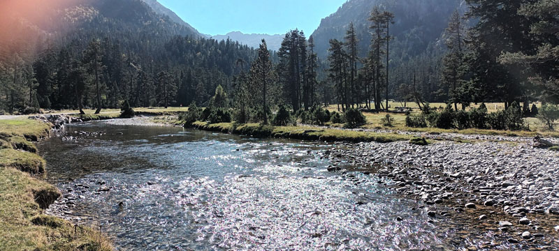 Le plateau d'Estalounqué ensoleillé est splendide. Le ruisseau coule comme une rivière d'argent scintillant sous les rayons du soleil. Lorsque nous parvenons au plateau du Cayan la vue est aussi magnifique. Inondé de soleil, le site est fantastique. Les cours d'eau brillent de mille éclats d'or et d'argent.