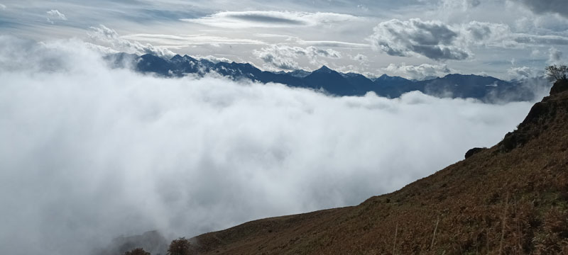 À la sortie du bois le cheminement serpente dans les pentes herbeuses et permet de repérer Claude. A 12 h 40 nous arrivons au col de Sonères. Malgré les larges bandes de nuages, nous percevons les cimes : pic de l'Arbizon, pic du Midi de Bigorre, Montagne d'Areng, au nord Nistos Cap Nestés ses sommets et la cabane d'Ilhet.
