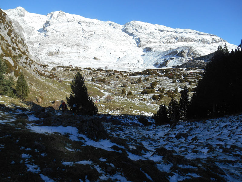 Il est 13 h. Nous nous installons contre des rochers plus ou moins à l'abri du vent glacial. Frigorifiés nous repartons et montons sur une crête Majada Lecherin Bajo, pour voir le panorama. Ensuite nous descendons par le Plano de la Balsa, en empruntant une partie du trajet de la montée. Les groupes se sont étirés et c'est en parvenant au refuge non gardé que nous nous regroupons.