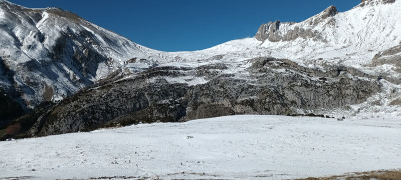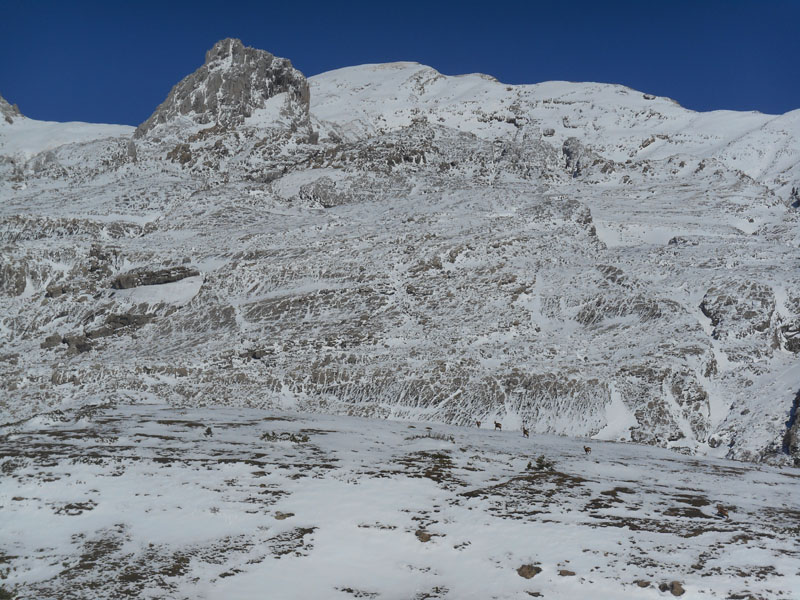 Le cheminement se poursuit au nord par Majada de Gabardito. C'est une traversée de Lapiaz, de petites crêtes, de monticules. Soudains, trois isards se détachent dans la neige. Ils nous observent. Puis d'autres les rejoignent. Ils sont une vingtaine. Ils détallent à notre approche. Quel beau spectacle offre la montagne !