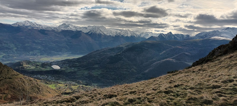 Nous longeons la crête ouest et parvenons sans peine au Soum de La Pène. La crête humide, glissante n'engage pas à poursuivre. La vue de ce beau panorama est imprenable. Nous repartons en arrière. Un coin plat herbeux est tout à fait adapté pour déjeuner sous le regard des montagnes.
