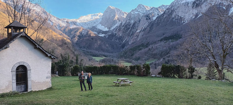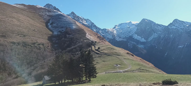 Départ avec Andrée et Ludovic dans la vallée d'Aspe. Par Accous la petite route amène à la chapelle San Christau et la fontaine du même nom. Déjà 10 h. Nous suivons à l'est le bord herbeux de la route qui monte par un virage en épingle pour s'orienter au nord-ouest. La température négative au départ augmente progressivement. Les nuages se dissipent peu à peu. D'anciennes coulées de neige fondent lentement au soleil.