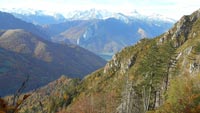 Je descends, au nord, par un couloir raide et enneigé. Je dépasse le Pas det Oeilher (1609 m) et me dirige vers les cabanes de Bésur. Le sentier enneigé est très glissant. Par précaution je grimpe vers la crête. Je domine les cabanes de Bézur et parvient au Soumets, à 12 h 20. Je scrute les environs, admire les cimes et reviens en arrière.