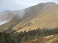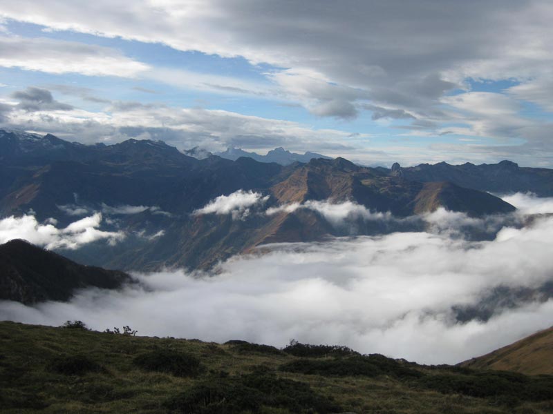 Nous atteignons la cabane Lassébie, où une pause ravitaillement est préconisée. L’appel des cimes nous conduit à repartir, malgré la bruine. La traversée du Plaa d’Auzu nous entraîne sur une longue crête qui nous propulse sur le pic d’Auzu et sa seconde pointe, baigné dans les brumes.