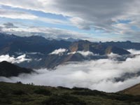 La piste est coupée par des sentiers raides, dans les pentes herbeuses. Le relief a disparu, dans les méandres nébuleux.