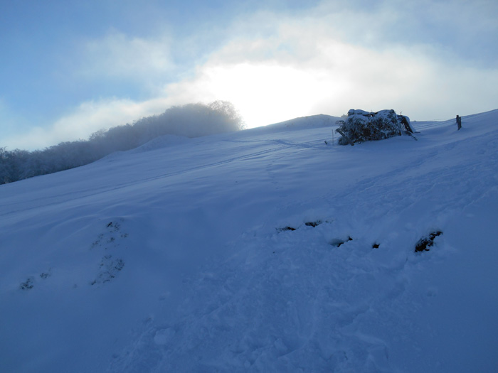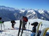 Nous filons sur la crête, puis plongeons dans la forte pente (+ de 30%), respectant un écart important entre chacun.De texture changeante : poudreuse, puis croûtée, la neige nous surprend à chaque virage. La négociation n'est pas toujours aisée !