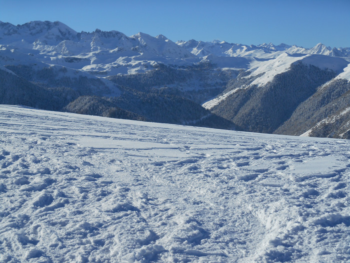 Le rythme est rapide. Les secteurs Seras, Gargarède, Courade de Bazust sont enchaînes, en s'espaçant sur la forte pente, pour éviter les ruptures de plaque. Nous débouchons sur la crête Le Couret. Un magnifique paysage se dégage. Des dentelles de glace,face au vent, habillent élégamment les buissons argentés scintillants au soleil.