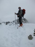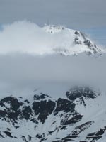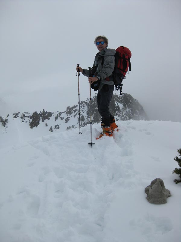 A 7 h30 nous partons avec Roger et Frédéric en direction de Luz Saint Sauveur et Super Barèges, où nous nous garons dans la station peu fréquentée. Nous montons le long d’une avalanche, alors que le brouillard nous enveloppe peu à peu. C’est jour blanc et nous ne distinguons plus le relief, dans le vallon de Campana. Les pentes, dans le secteur de Bat de Barrère se confondent et l’orientation devient délicate, parfois incertaine. Lorsque nous parvenons dans le couloir, qui conduit vers un col, donnant accès aux crêtes, nous savons que nous approchons du but. La pente finale, débouchant sur une corniche de neige, nous entraîne à la pointe la plus élevée de la crête de La Pègue.