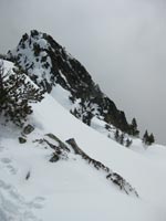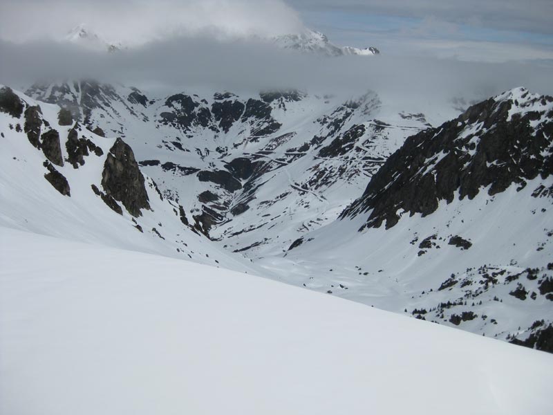 La descente est envisagée avec prudence, mais la neige mouillée est tout à fait praticable. Le couloir est franchi sans mauvaise surprise. Nous enchaînons les virages, déclanchant, malgré tout, de grosses boules de neige, sans conséquence et sans risque de perdre la boule.
