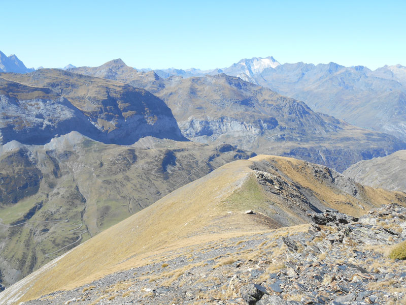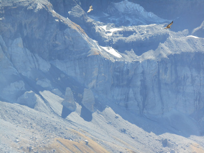 Le paysage est grandiose. Le cirque de Troumouse dévoile ses parois verticales, impressionnantes, avec le pic de Gerbats, en face, pic Heid, la Munia, Mont Perdu, Gavarnie, etc. Nous revenons sur un pic intermédiaire plus spacieux, pour déjeuner. Quelques vautours planent et disparaissent derrière les cimes.