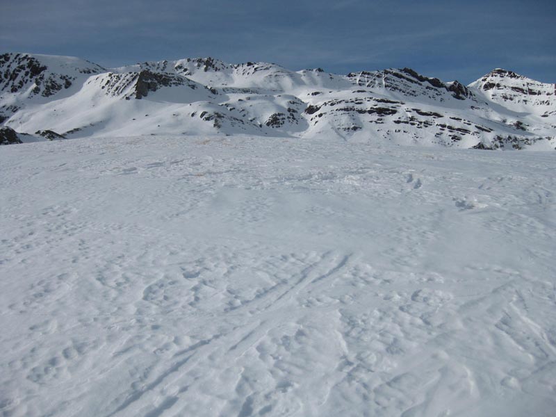 Nous montons vers la crête entre le Vertice d'Anayet et Las Arroyeras, mais c'est sur une bosse que nous nous arrêtons à 13 h. Nous déjeunons assis sur des rochers, contemplant le cirque enneigé.
