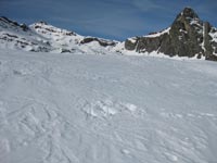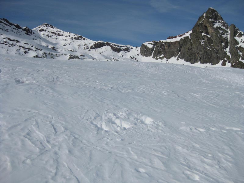 La descente débute sur la neige gelée et le dérapage permet de franchir les passages raides, notamment le franchissement de la corniche. Nous passons au dessus du goulet, en traversée, au bord d'une barre rocheuse. Après le plateau, nous choisissons la piste de ski, que nous dévalons à vive allure avec Marie Jeanne, même si nous descendons un peu trop bas.
