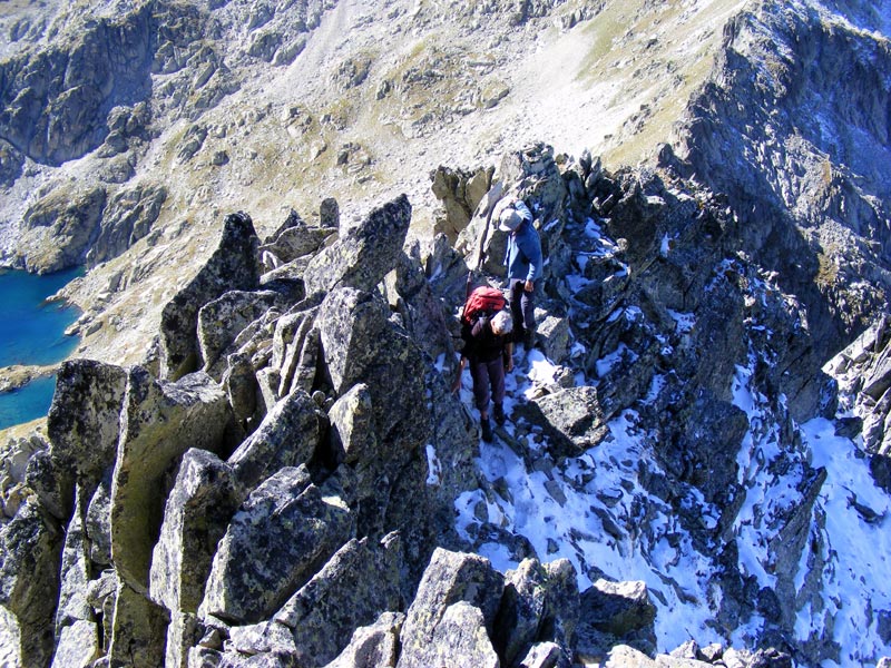 La traversée des plateaux du Clot et du Cayan est peu élevée, et toujours magnifique, parcouru par le ruisseau du Marcadau, courant insouciant dans les prairies, effleurées des gelées matinales. Nous nous élevons dans le secteur de Coste de Castet Abarca, franchissant un bois, salués par un écureuil, pour parvenir sur un vallon herbeux où, détalent des isards. Les lacs de l’Embarrat offrent leurs eaux gelées aux rayons du soleil qui scintillent comme des éclats précieux de pierres inconnues. Après le lac du Pourtet et une halte ravitaillement, les difficultés se présentent. Une pente herbeuse particulièrement raide, trois cent mètres de dénivelé, se présentent. Il nous faut atteindre une brèche à droite des Aiguilles du Pic d’Arrouy et le col. La monté s’avère rude. Marie-Jo grimpe devant, suivi par Yves. La fatigue et les crampes me gênent. Un passage dans la neige fraîche est particulièrement délicat . Enfin nous parvenons au col du Pourtet ( 2604m ). Une arête redressée amène au Pic d’Arrouy exigeant une grande attention. Nous parvenons au sommet en quelques minutes. Alors s’ouvre un panorama d’une splendeur éblouissante. Un défilé de cimes : Chabarrou, Arratille, Fache, Cambales, Balaïtous, Palas, Ossau, Anie et bien d’autres, s’exposent à nos yeux émerveillés.