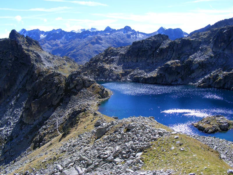 Après un repas sommaire, nous retraversons l’arête et descendons par une crête, évitant la pente neigeuse très raide. Quelques passages dans les rochers sont à désescalader, les pentes herbeuses frôlent des barres rocheuses, le repérage des cairns exige une grande attention. Finalement nous atteignons le lac du Pourtet. La descente sur le sentier n’est plus qu’une promenade d’agrément. Nous laissons les lacs de l’Embarrat s’endormir dans les rayons dorés d’un soleil couchant. Nous dévalons les plateaux du Cayan et du Clot, marquons une pause boisson au chalet refuge et retrouvons la voiture, puis la vallée qui déroule sa route sur notre trajet, jusqu’à Lourdes, où nous nous séparons, chacun rejoignant son domicile respectif. Ce fut 9 heures de course magnifique, l’embarras n’étant pas là où on l’attendait.