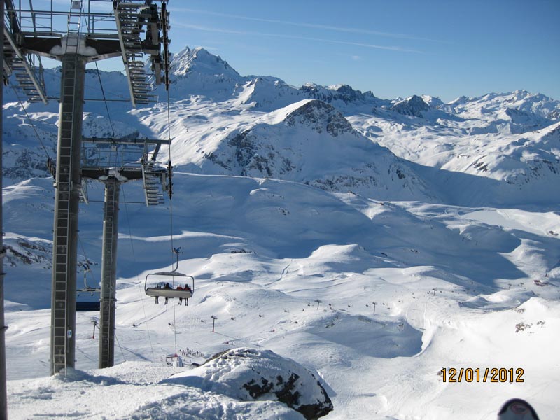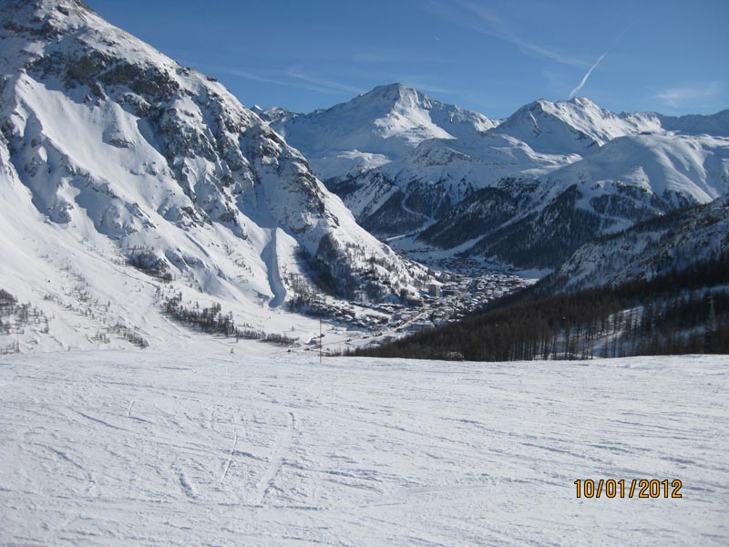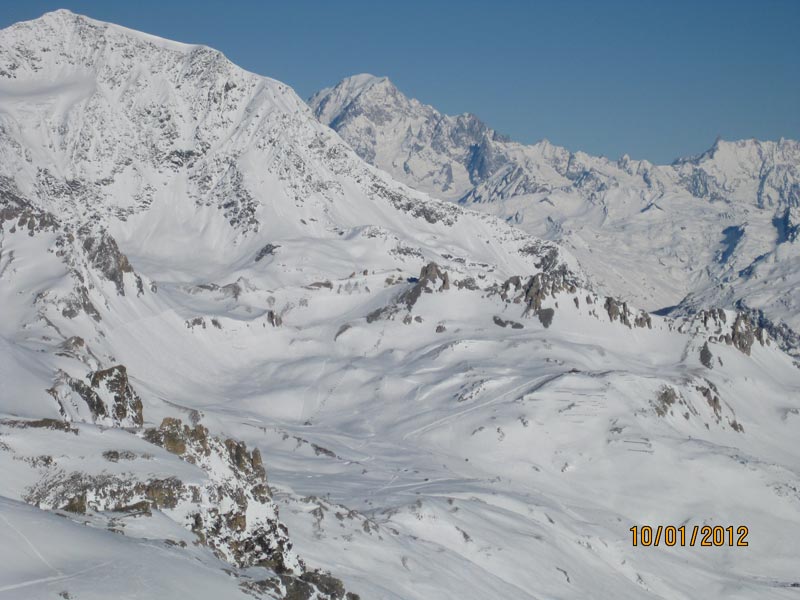 Nous skions dans les secteurs de Grand Pré, l’Epaule du Charvet, puis de Val Claret et de Tignes. J’apprécie les paysages grandioses, lorsque nous skions prés de la Grande Motte et la Grande Casse, des sommets dépassant les 3600 m.. Nous traversons les pistes du col de Ves, mais aussi de l’Aiguille Percée, ou du vallon de la Sache. Je réussi à prendre en photos le Mont Blanc, dégagé des nuages et les Grandes Jorasses. Lorsque les pistes ne sont pas mobilisées pour des compétitions, nous nous lançons dans les pistes, raides et magnifiques, à travers les sapins, de « Orange » et « O.killy ».