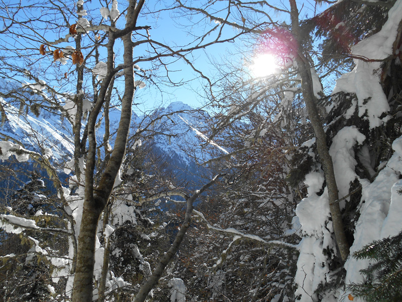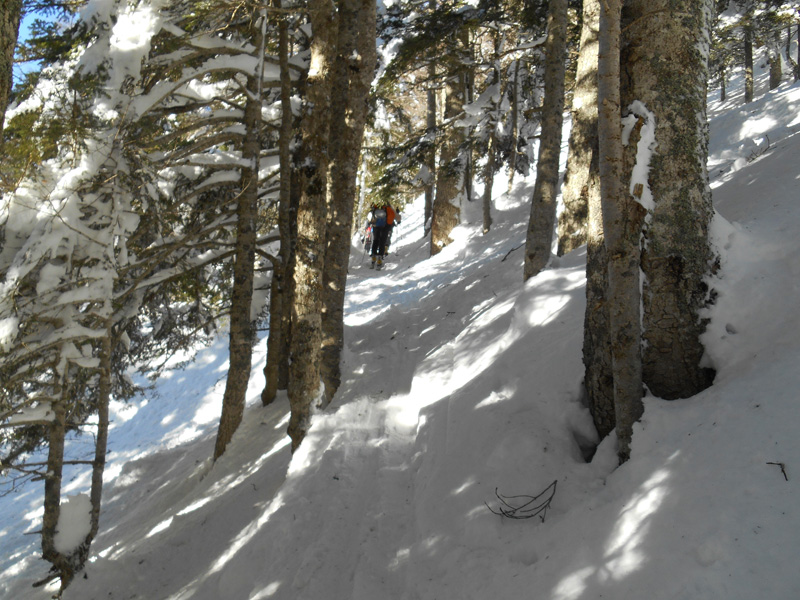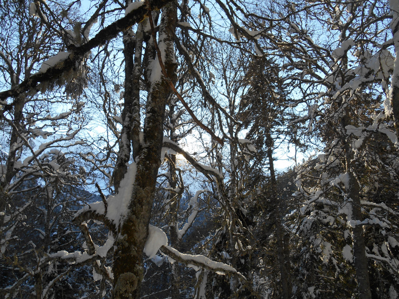 Nous repartons et atteignons la forêt. Un long couloir en neige poudreuse, nous attire et nous jouons aux virtuoses du ski. La suite est moins réjouissante. Nous devons retrouver le passage de la montée dans une partie touffue. Le ski devient acrobatique et même un sport de combat. Il faut passer par dessus des arbustes, éviter les branches en travers, sauter par dessus des trous, plonger dans la neige pour éviter une bûche ou s'en prendre une !