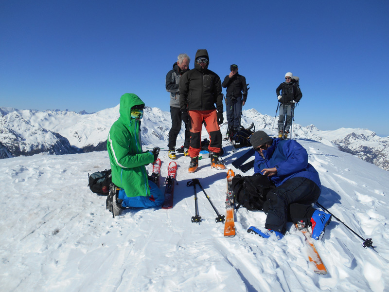 La traversée est longue. Nous parvenons sous une pente raide qui grimpe au col de Magnabaigt. Nous posons les couteaux sous les skis, la neige est glacée. Un peu d'inquiétude passée, nous apprécions l'arrivée au col. La crête nous conduit ensuite au pic de Chérue, à 12 h 30.