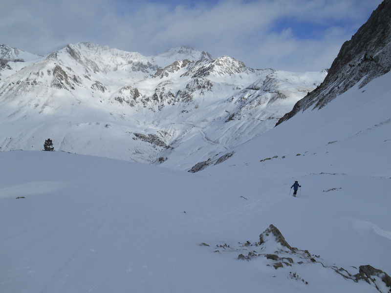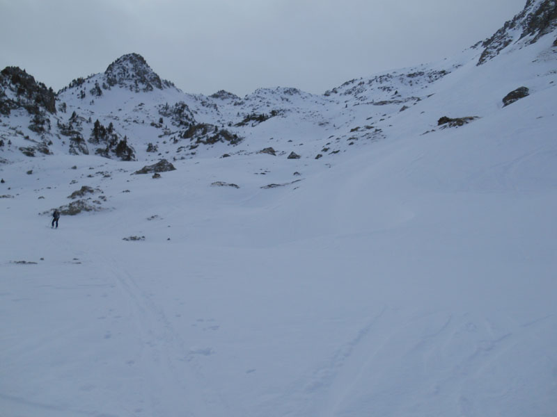 Nous parvenons dans le vaste vallon Bat de Barrère, où, après l'avoir traversé, nous nous accordons une pause ravitaillement derrière un gros rocher, protégés des coups de vent. Trois ou quatre skieurs s'orientent vers les crêtes de Campana. Nous nous orientons vers l'ouest. Nous nous faufilons entre les rochers et les trous que nous ne repérons qu'au dernier moment. Puis nous suivons une crête fine, au-dessus d'une goulotte, pour parvenir, enfin à un petit col. Je tente de monter plus haut, mais la neige est glacée. Je redescends vers Yves.