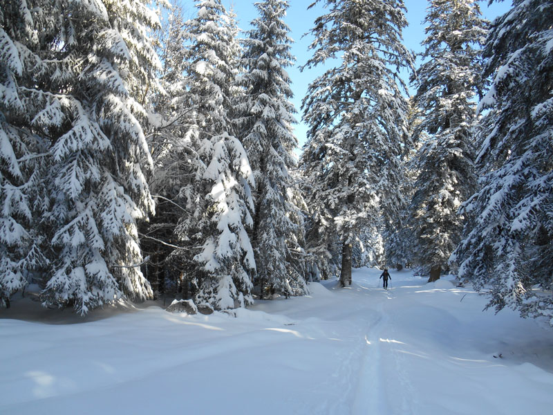 A 9 h 40, nous partons, skis aux pieds et traversons le plateau fraîchement enneigé. Nous suivons la piste dans la forêt du Différend. Couverts de voiles blancs, les sapins ont revêtu leur parure des jours de fêtes. Passer sous les branches aux dentelles de neige semble nous amener dans un monde féerique.