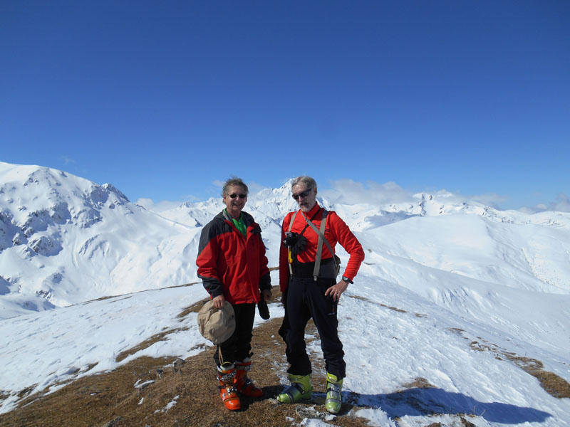 Puis vers 13 h 30, nous repartons. Nous suivons la crête dans une neige encore gelée et ensuite basculons au nord, dans des pentes en neige poudreuse. Le ski est agréable. Nous jouons sur les vagues du relief neigeux, n'éclatant que sur notre passage.