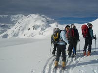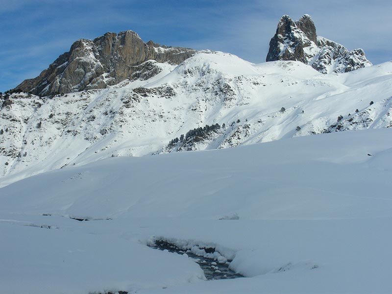Sortis de ce pas périlleux, la vision s’améliore et nous repérons le pic de Canaourouye. Nous nous lançons à sa conquête et nous l’atteignons vers 15h15. La descente est un moment de bonheur, dans une neige poudreuse et en couche épaisse. Chacun interprète sa participation dans l’improvisation de son inspiration, la texture de la neige permettant de se livrer à toutes sortes de fantaisies. La neige douce, fraîche, blanche, étincelante, est un dessert qui se déguste par les spatules.