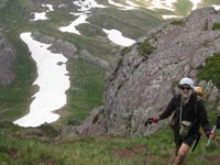 Nous devinons un couloir bien raide, qui permet un passage. Long d'une centaine de mètres, nous nous engageons dans une escalade, sans filet. Ceci se termine par une petite cheminée parsemée d'herbe mouillée, qui n'incite pas à la glissade.