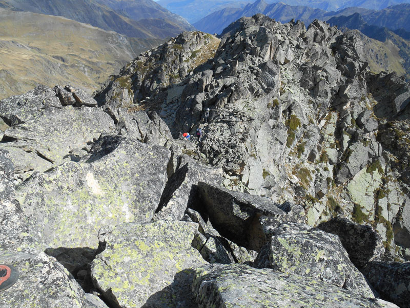La vue panoramique déploie des sommets à l'infini. Nous déjeunons abrité du vent par les rochers. Pour la descente, nous suivons l'arête sud et est, vers l'inconnu. Les passages de désescalades sont impressionnants, au-dessus du vide, sans sécurité. La vigilance est de mise, comme la recherche des prises sûres.