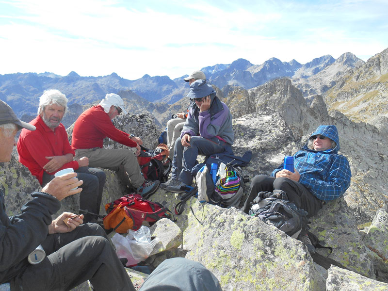 Une montée raide nous entraîne au col de La Haugade (2376 m.), après une courte pause grignotage sur un plateau herbeux. Le col supérieur de La Haugade ( 2378 m.) est franchi vers 10 h. A l'est, l'ascension du Tuc Arrouy, présente de nouveaux paysages, avec la vallée du Marcadau, à nos pieds, à l'horizon les cimes qui se déclinent, les pic Vignemale, Grande Fache, Cambales, Balaïtous, Grand Barbat, Monné, etc.