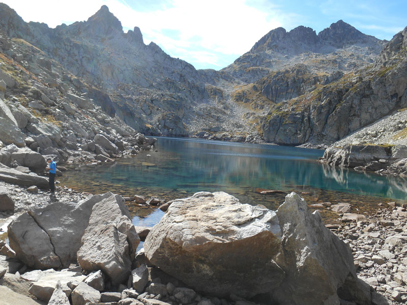 Nous contournons vers l'ouest pour affronter un long couloir herbeux et caillouteux très raide semblant se jeter dans le vide. Enfin nous parvenons dans des blocs rocheux, avec soulagement. Le cheminement longe le petit lac du Hourat (2343 m.), bloqué dans les rochers, puis par un sentier caillouteux, longe le lac d'Ilhéou et nous dépose auprès du refuge d'Ilhéou.